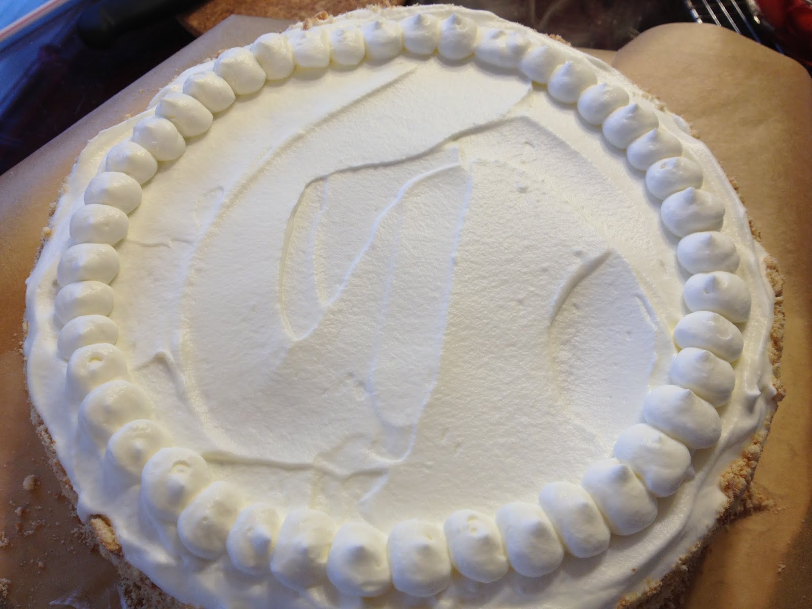 To frost the cake, I dropped a generous amount of whipped cream on top of the cake and spread the excess outward and then onto the sides of the cake. I took the leftover whipped cream and put it in a ziploc bag, cut a small hole, and piped little dots around the edge, just to be a little fancy.