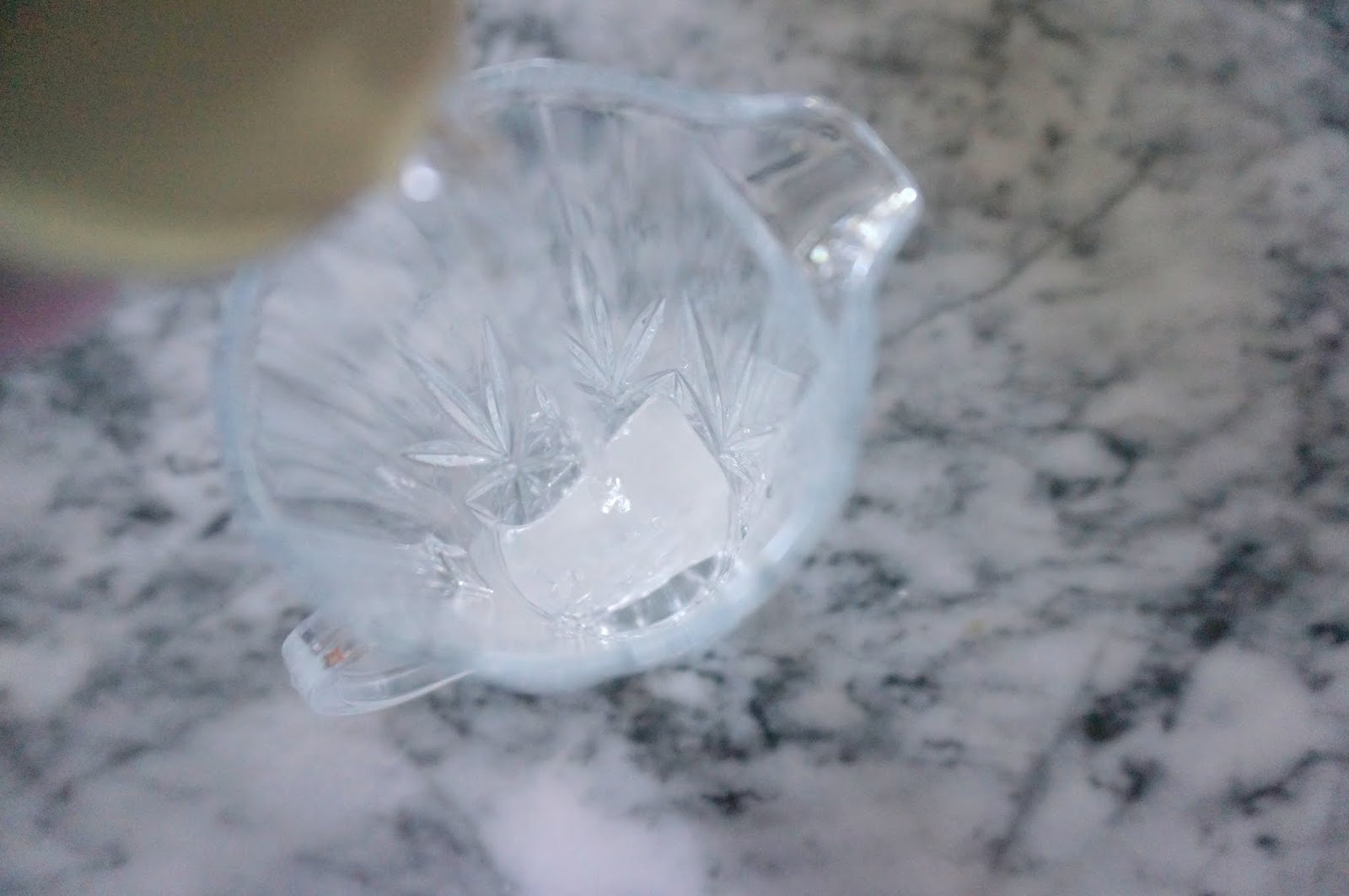 This is a super easy cocktail to whip up. Start by grabbing a little pitcher and drop in some ice. Take the lemon twist and squeeze it over the ice. Squeezing the lemon rind will release a spray of essential oils.